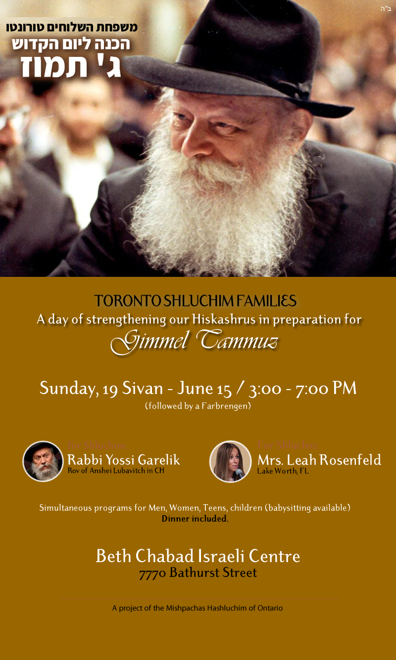 In preparation for Gimmel Tammuz – 31 Years, Shluchim families from across the GTA will gather together for a day focused on strengthening their Hiskashrus to the Rebbe.